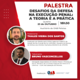 Nesta quarta-feira, 23 de outubro, às 18h30, o auditório da OAB Pelotas será palco de palestra sobre os desafios enfrentados pela defesa na execução penal: a teoria e a prática. 📢 Palestrantes: Thales Vieira dos..