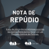 A Comissão de Igualdade Racial da Subseção de Pelotas manifesta publicamente repúdio a ato de intolerância religiosa ocorrido na manhã desta quinta-feira (24), no Mercado Central de Pelotas. Na oportunidade, equipe de um dos candidatos..