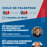 No dia 3 de julho, às 18h30, no Auditório da Subseção, as comissões de Direitos Humanos – CDH e Seguridade Social – CSS promovem Ciclo de Palestras com os temas: Tema: Reformas (novas?) da Previdência?..