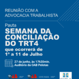 Atenção, advocacia trabalhista! No dia 27 de junho, às 17h30, acontece reunião no Auditório da OAB Pelotas para tratar da Semana da Conciliação do TRT4, que ocorrerá entre os dias 1º e 11 de..