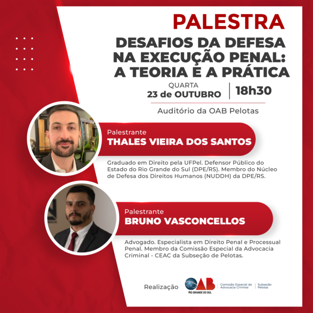 Nesta quarta-feira, 23 de outubro, às 18h30, o auditório da OAB Pelotas será palco de palestra sobre os desafios enfrentados pela defesa na execução penal: a teoria e a prática.