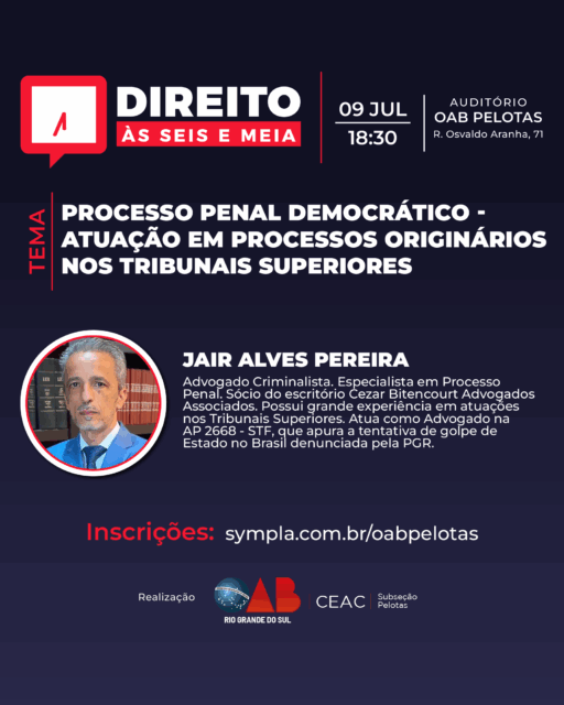 É no dia 09 de julho, a partir das 18h30, no Auditório da OAB Pelotas – R. Osvaldo Aranha, 71.