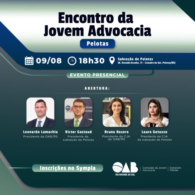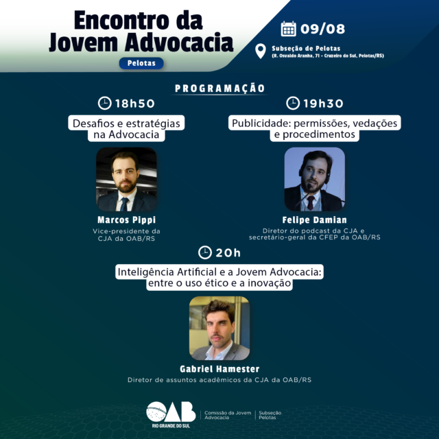 A Subseção de Pelotas sediará no próximo dia 9 de agosto, a partir das 18h30, o aguardado Encontro da Jovem Advocacia. O evento contará com a presença de destacados profissionais do setor jurídico, abordando temas cruciais como estratégias na advocacia, publicidade na profissão e os impactos da inteligência artificial.