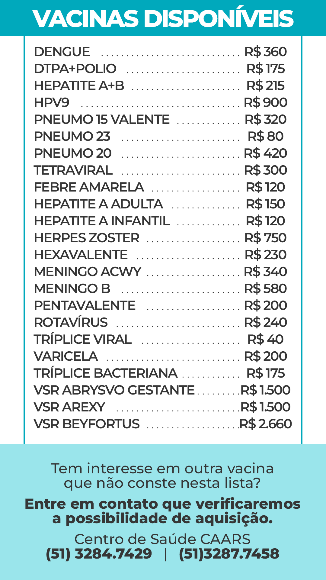 Confira o valor das vacinas no link: https://admin.caars.org.br/arquivos/file_6824e8e28c84f.png