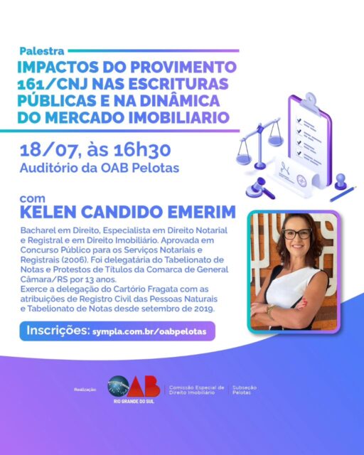 A Comissão Especial de Direito Imobiliário da OAB Pelotas promove a palestra “Impactos do Provimento 161/CNJ nas Escrituras Públicas e na Dinâmica do Mercado Imobiliário”, que acontecerá no dia 18 de julho, às 16h30, no Auditório da OAB Pelotas.